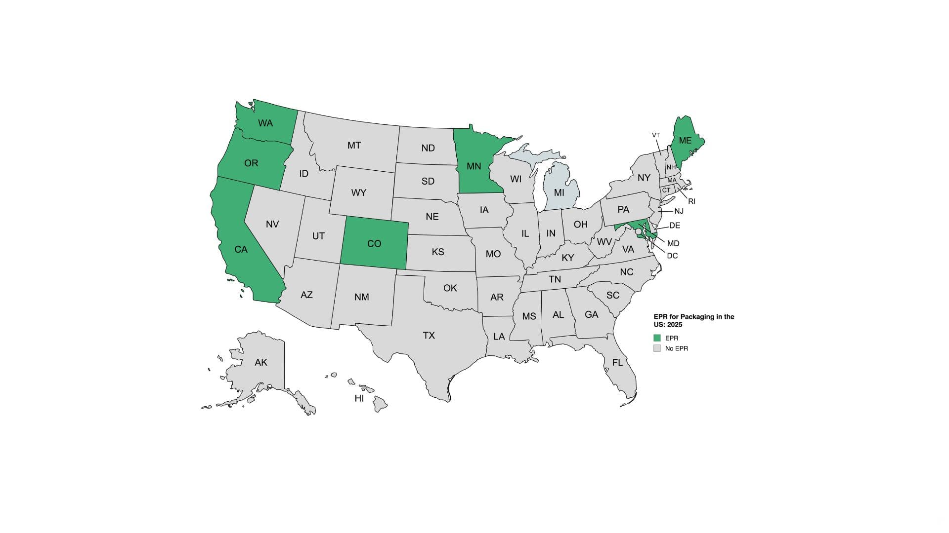 Alongside Oregon, six other states—marked in green on the map above—are also implementing their own EPR for packaging programs with different timelines, requirements, and more. If you are new to EPR for packaging, check out this article and continue reading from here.