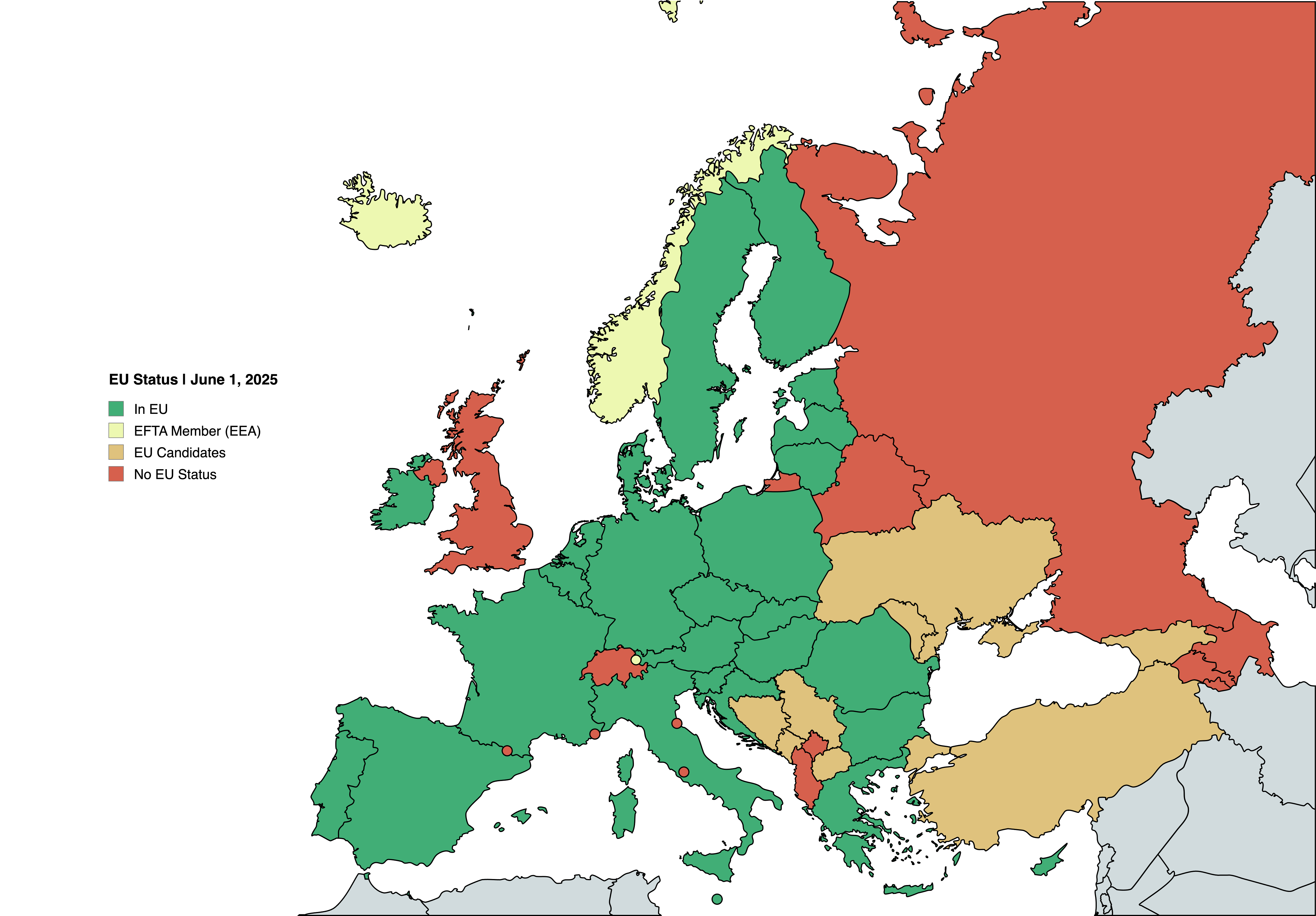 Keep in mind that other nations may join the European Union, with Ukraine, Bosnia and Herzegovina, Georgia, Moldova, Montenegro, North Macedonia, Türkiye, and Serbia currently have “candidate country” status (marked in orange).